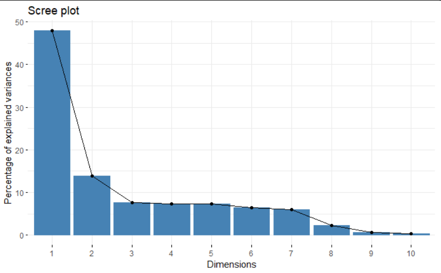 Selanjutnya akan ditentukan berapa komponen yang akan dipertahankan. Penulis tidak ingin menentukan ini berdasarkan persentase. Hal ini dikarenakan semakin banyak variabel penelitian, mempertahankan tingkat variansi dijelaskan tertentu akan membutuhkan banyak variabel. Maka dari itu penulis memutuskan untuk menggambarkan scree plot persentase variansi dijelaskan terlebih dahulu. Hasilnya adalah sebagai berikut :