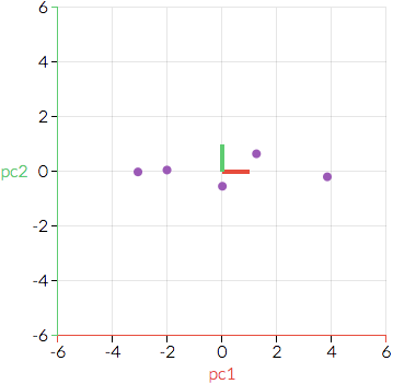 Gambar diatas merupakan hasil transformasi PCA. Secara esensial, tidak ada perubahan nilai. Yang dilakukan hanyalah mengganti perspektif. Dalam contoh ini hanya terdapat dua variabel yang tentunya bukan data besar. Untuk penerapan pada data besar, ketika dimensi yang ada sangat banyak, maka kita akan "memampatkan" data sedemikian kita hanya memperhatikan dimensi-dimensi yang dominan. Pemampatan ini dapat diilustrasikan dengan contoh sebelumnya dengan cara memproyeksikan ke satu dimensi. Hasilnya kira-kira akan terlihat seperti berikut :