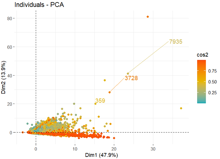 Dengan mempertahankan 2 dimensi pertama, kita selanjutnya dapat melakukan analisis kontribusi individual dan variabel terhadap dimensi baru. Analisis kontribusi ini dapat kemudian digunakan untuk melakukan prediksi. Plot-plot berikut merupakan kontribusi yang diberikan individu dan variabel untuk 2 dimensi pertama PCA :