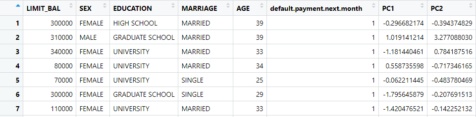 Setelah data siap, selanjutnya dapat dimulai transformasi variabel dengan PCA. Dengan menggunakan software R, hasil transformasi data dapat langsung dikeluarkan. Berikut adalah 7 pengamatan pertama dari data training pada komponen PCA yang didapatkan :