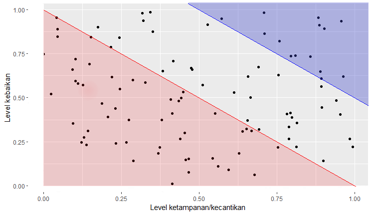 Dari penjelasan poin 1 diatas, dapat kita lihat bahwa sebenarnya pada keadaan yang berlaku bagi kebanyakan orang secara umum, pilihan kandidat pasangan bagi mereka telah terbatas. Hal ini direpresentasikan pada area non-warna pada plot diatas. Sehingga, secara otomatis ini memunculkan poin 2 dimana pilihan kandidat yang realistis bagi kebanyakan orang memiliki kecenderungan berkorelasi negatif. Yaitu antara kualitas sifat dengan penampilan pasangan akan menurun ketika nilai lainnya naik.